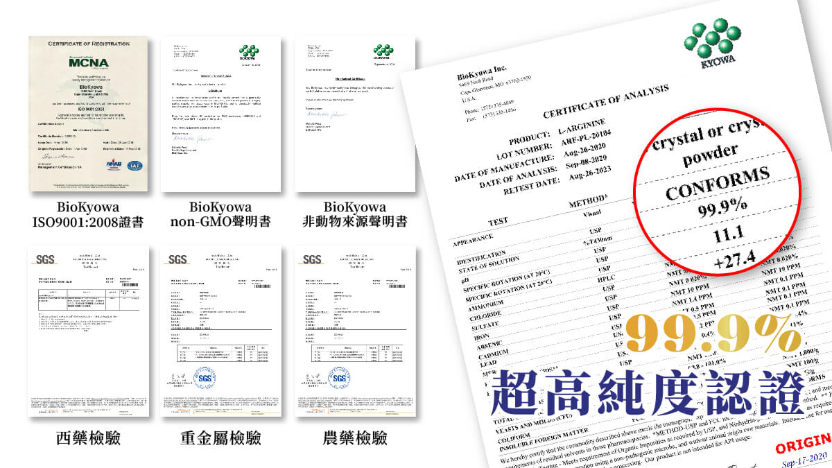 與來自日本的精胺酸權威品牌Kyowa®合作,取得商標授權,使用Kyowa®最高級的天然左旋精胺酸做為原料,讓你再也不用吃會對身體造成負擔的化學成品