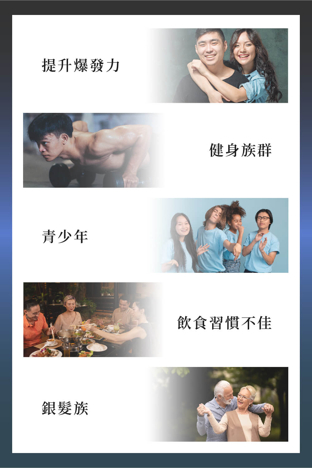 | 適用族群 | 健身族、缺乏爆發力的人、青少年、飲食習慣不佳者、銀髮族 |