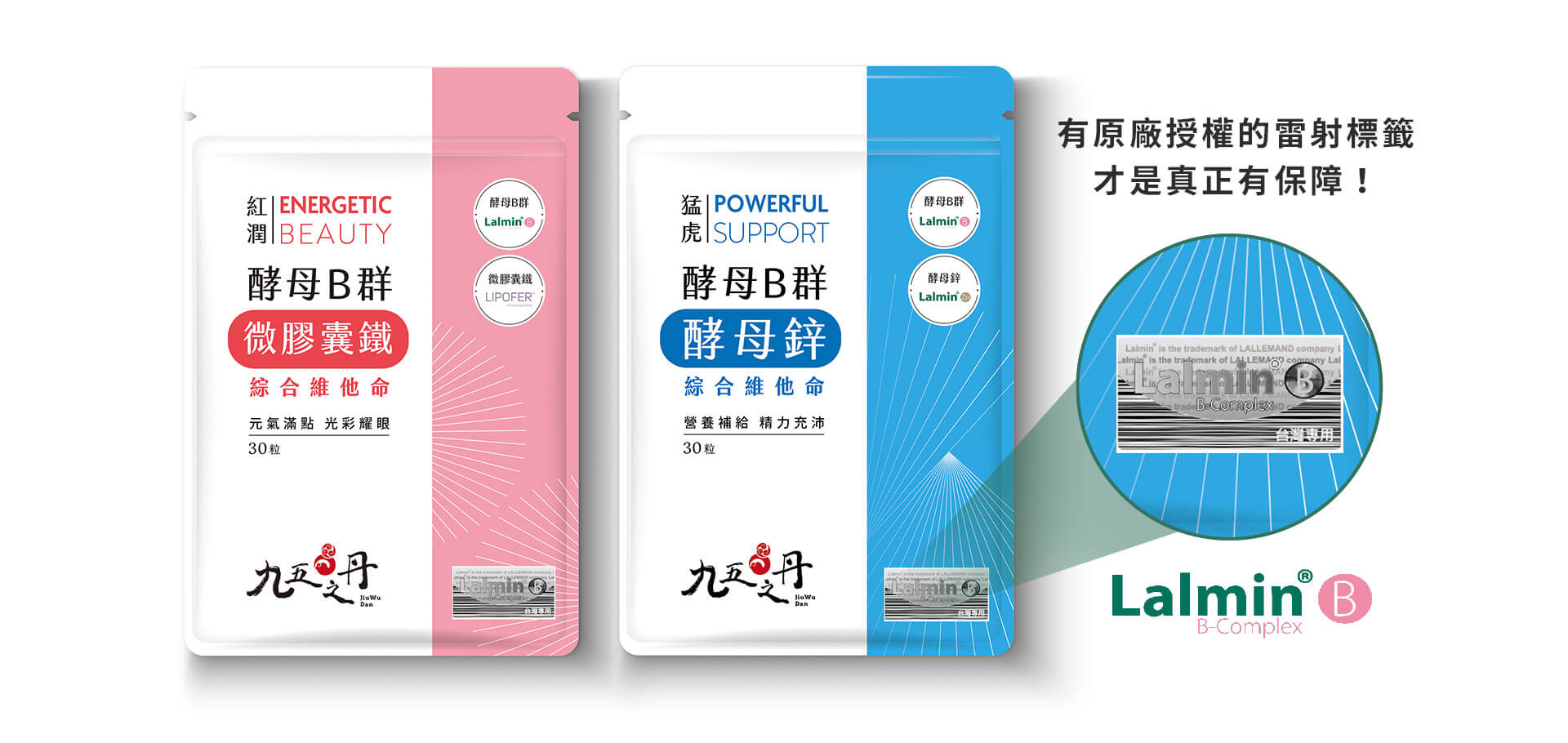 九五之丹取得加拿大原廠Lallemand公司商標授權使用雷射防偽標籤,100%使用Lalmin®酵母B群,且有效含量達原廠指定的500毫克/每天。選購酵母B群時務必認明此雷射防偽標籤,如沒有此標籤或是不敢放商標,表示其成份一定不是原廠或是量不足,要小心別買到不明的酵母B群,不只傷荷包也傷身。