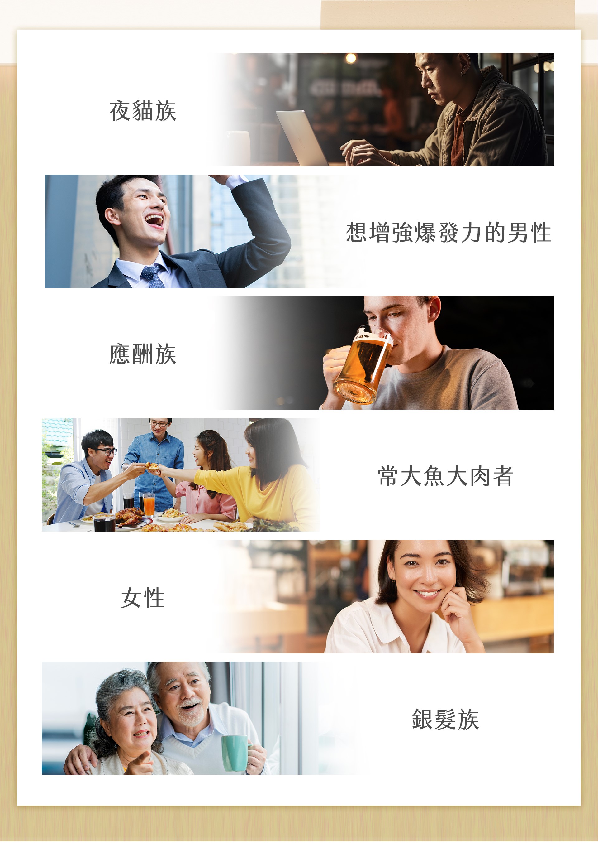 | 適用族群 | 大夜班、應酬族、常熬夜、缺少運動族、女性保養、銀髮族 |
