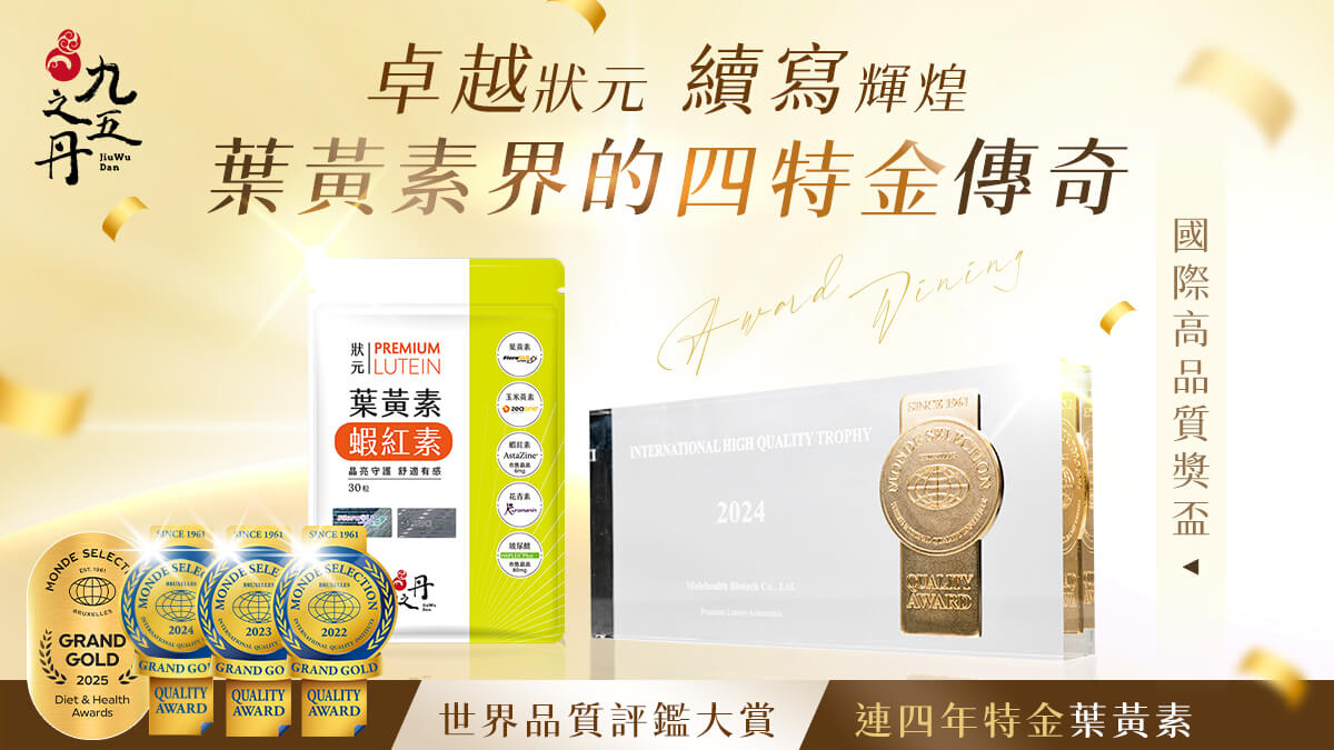 在世界品質評鑑大會上,除了每年針對優秀產品頒發特金獎、金獎、銀獎和銅獎外,對於連續三年獲得特金獎或金獎的優質產品,還會頒發更高等級的特殊獎盃-國際高品質獎盃,是該品項的最高榮譽象徵。「狀元.葉黃素+蝦紅素」在2024年奧地利維也納舉辦的世界品質評鑑中榮獲此殊榮,也使九五之丹成為台灣第一個在葉黃素品項上獲得此特殊獎盃的品牌。