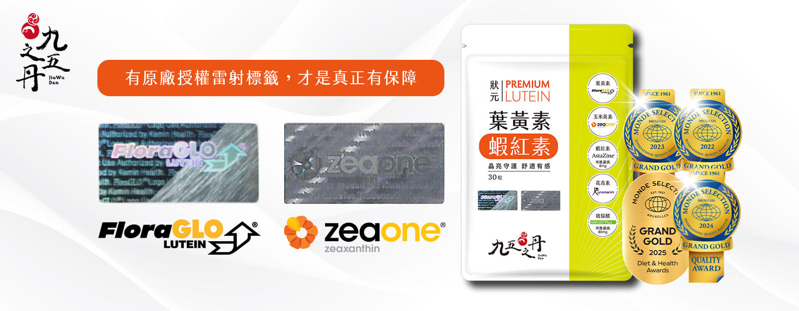 九五之丹取得美國原廠Kemin公司商標授權使用雷射防偽標籤,100%使用FloraGLO®葉黃素和ZeaONE®玉米黃素,且有效含量達原廠指定的10毫克/每天。選購葉黃素和玉米黃素時務必認明此兩大雷射防偽標籤,如沒有此標籤或是不敢放商標,表示其成份一定不是Kemin原廠或是量不足,要小心別買到不明的葉黃素,不只傷荷包也傷身。
