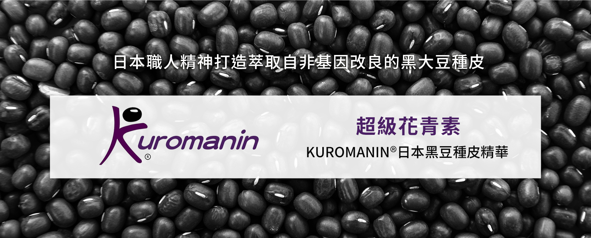 KUROMANIN® 黑豆花青素是日本經數十年研究開發出的專利,以特殊方法萃取自嚴選黑豆種皮,富含矢車菊素-3-配糖體 (Cyanidin-3-Glucoside),比山桑子或藍莓萃取物高三倍。