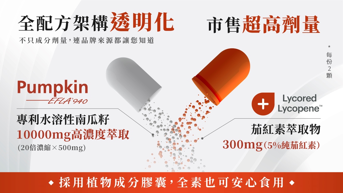 熟齡必備保健,嚴選Pumpkin EFLA®940專利南瓜籽,搭配Lycored Lycopene ™ 茄紅素,市售超高含量濃縮萃取南瓜籽搭配專利多氫茄紅素,幫助調整生理機能、維持健康,活力通暢無負擔!