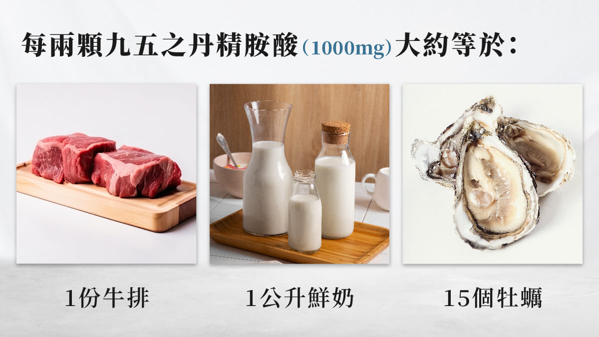 根據研究,一般人每日所需精胺酸為117mg/體重(kg),除了平時經由日常飲食攝取外,還會有1000至3000mg的空間,便可透過保健食品來額外補充。九五之丹 飛龍.高純度左旋精胺酸每份兩顆1000mg,大約相當於1份牛排/1公升鮮奶/15個牡蠣的精胺酸含量,超高劑量讓你一次就到位!