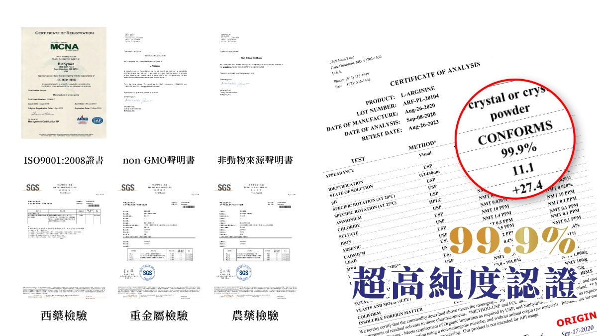 精胺酸若純度不高,那吃進去肚子裡的廢棄物也就多,九五之丹的精胺酸純度為99%以上,為市面上數一數二高