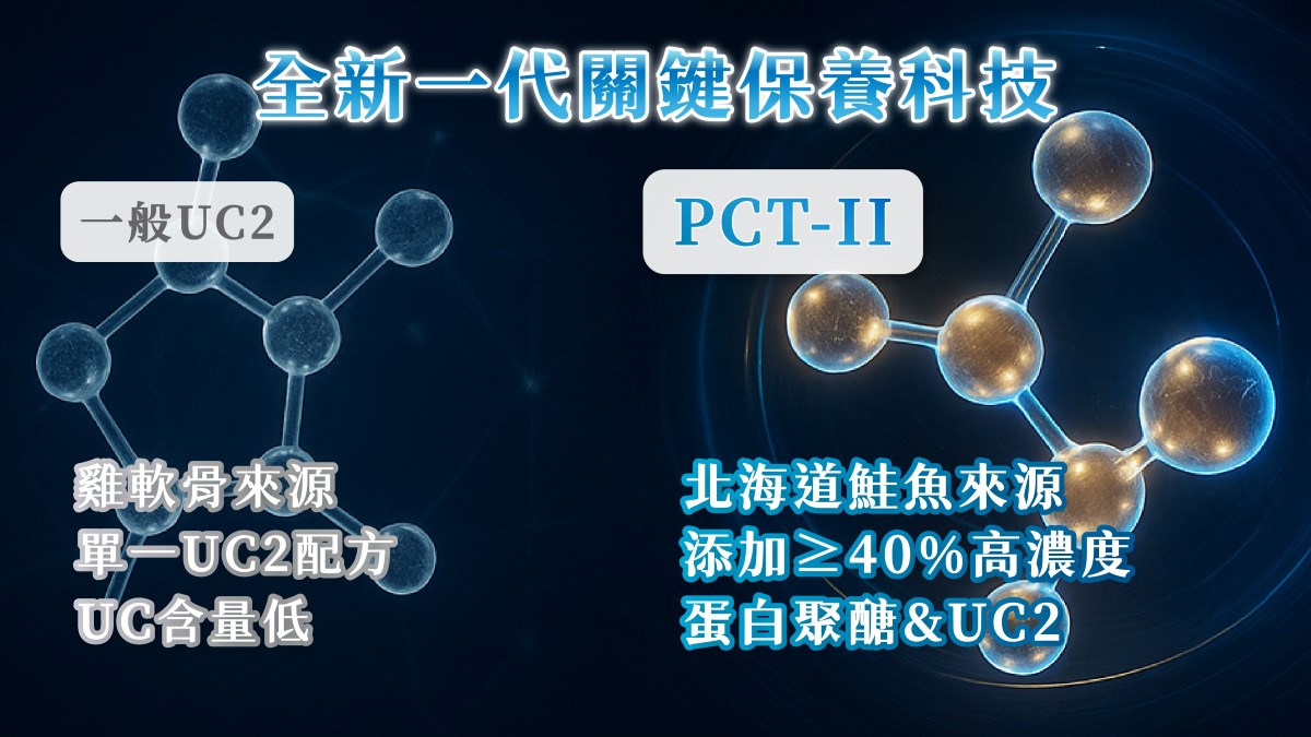 這代表補充含有 PCT2 的產品,不僅能獲得與 UC2 相同的「口服耐受」機制,幫助調節生理機能、啟動防護;更能利用蛋白聚醣極佳的保水特性與緩衝彈性,鞏固結構的潤滑度與穩固度。這種「調節」加「緩衝」的雙重機制,為日常行動打下了加倍紮實的基礎。