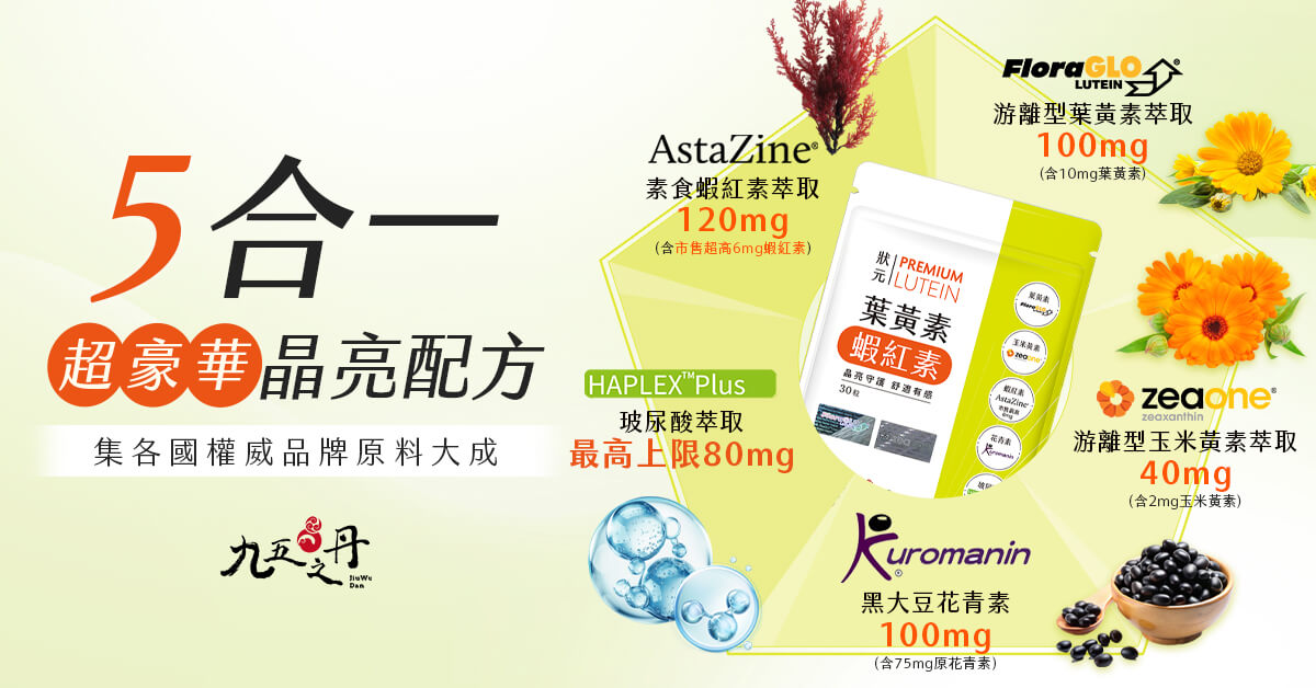 九五之丹【狀元.葉黃素+蝦紅素】通過 5 項專利大廠授權,包含 FloraGLO® 游離型葉黃素、ZeaOne® 玉米黃素、Astazine® 蝦紅素、KUROMANIN® 花青素與 Haplex® 玻尿酸,讓消費者親身感受每項原料的真材實料,市售最豪華晶亮組合,用心肯定吃的到!