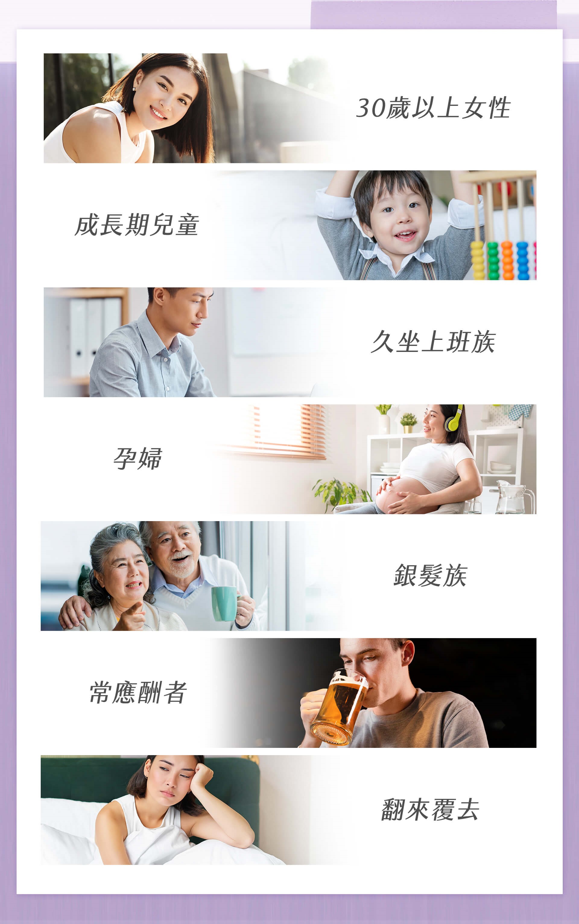 | 適用族群 | 兒童、常應酬者、上班族、孕婦、乳糖不耐症、老人 |
