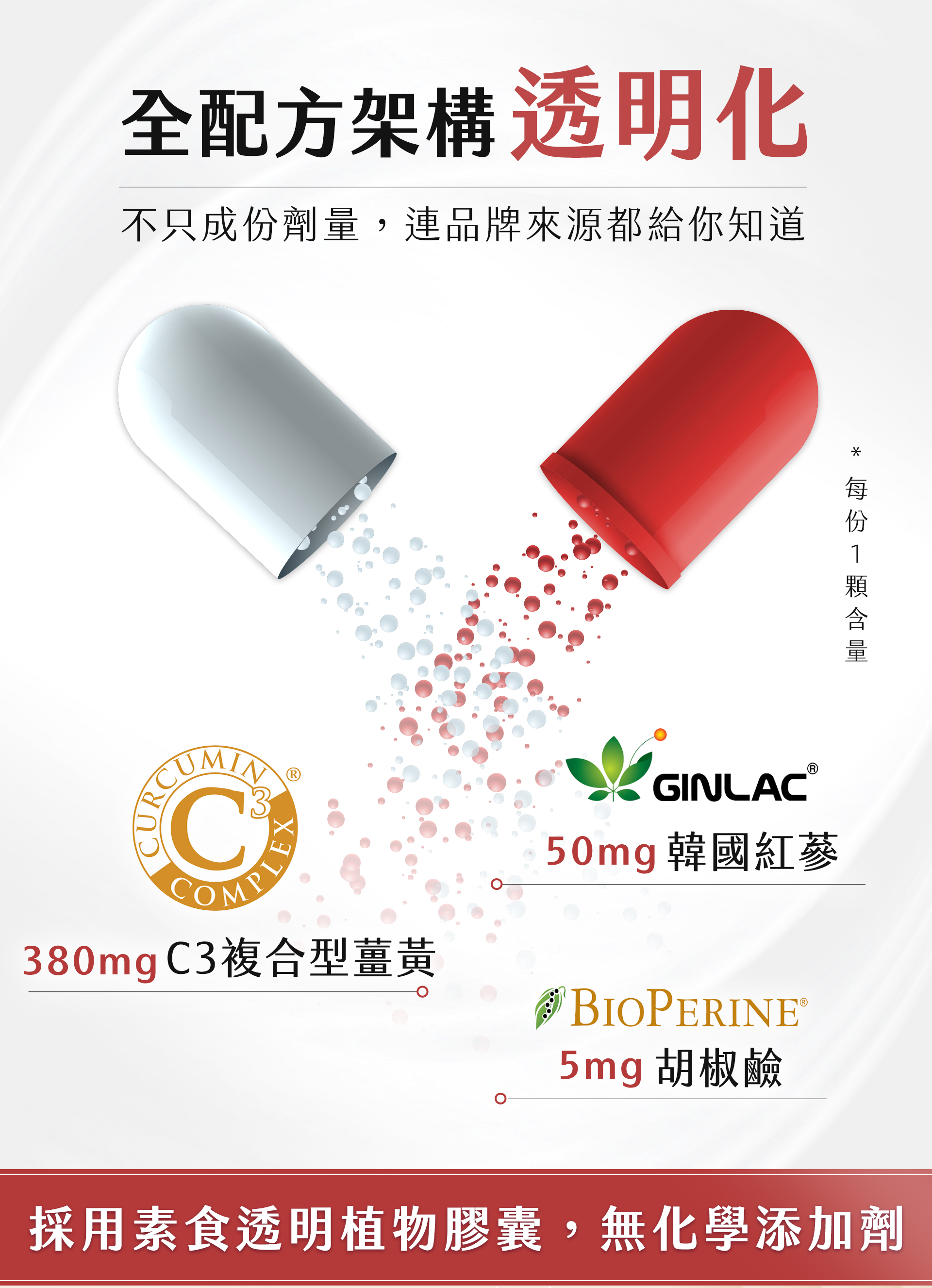 | 成份(每粒) | C3 Complex®薑黃萃取、Ginlac ®專利韓國紅蔘萃取、BioPerine®胡椒鹼 |