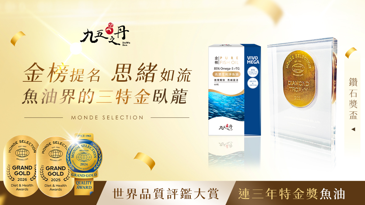 2026年,九五之丹「金榜.高濃度純淨魚油」憑藉連三年奪下特金獎的卓越表現,正式摘下這座鑽石桂冠。這座獎盃不僅是榮耀,更代表我們對原料選擇、製程控管的堅持,始終如一。