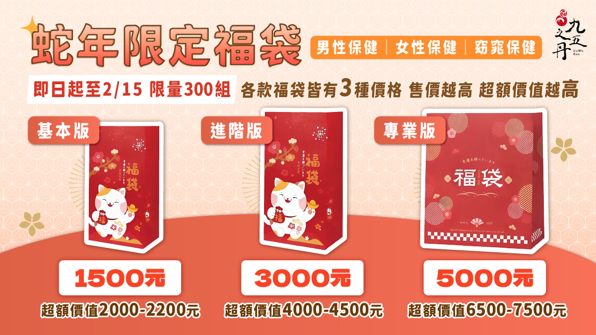 專為男性上班族設計福袋組,嚴選六大男性保健(黑瑪卡鋅、精胺酸、B群鋅、南瓜籽、薑黃紅蔘、南非醉茄)隨機出貨,共有三種規格($1500、$3000和$5000),絕對物超所值,即日起至2/15,限量共300份!從能量爆發、提升體力、熬夜加班到熟男保養,九五之丹將成為你的完美夥伴,在迎接蛇年的喜慶時刻,助你一整年盤踞巔峰!