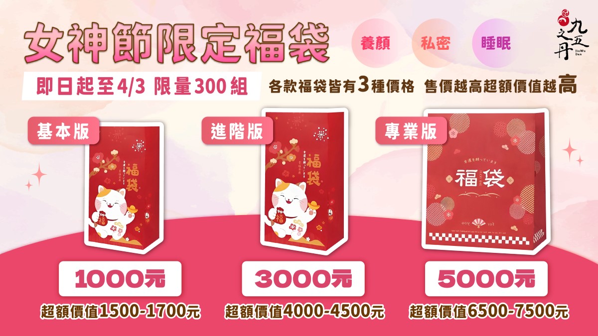專為女性上班族設計福袋組,嚴選養顏美容保健(膠原蛋白、美人酵素、B群+鐵)三種指定商品隨機數量,共有三種規格($1000、$3000和$5000),絕對物超所值,即日起至4/03,限量共300份!全方位提升的美麗,九五之丹將成為你的完美夥伴,讓自己在每一天都充滿自信與魅力,成為女王般的存在!