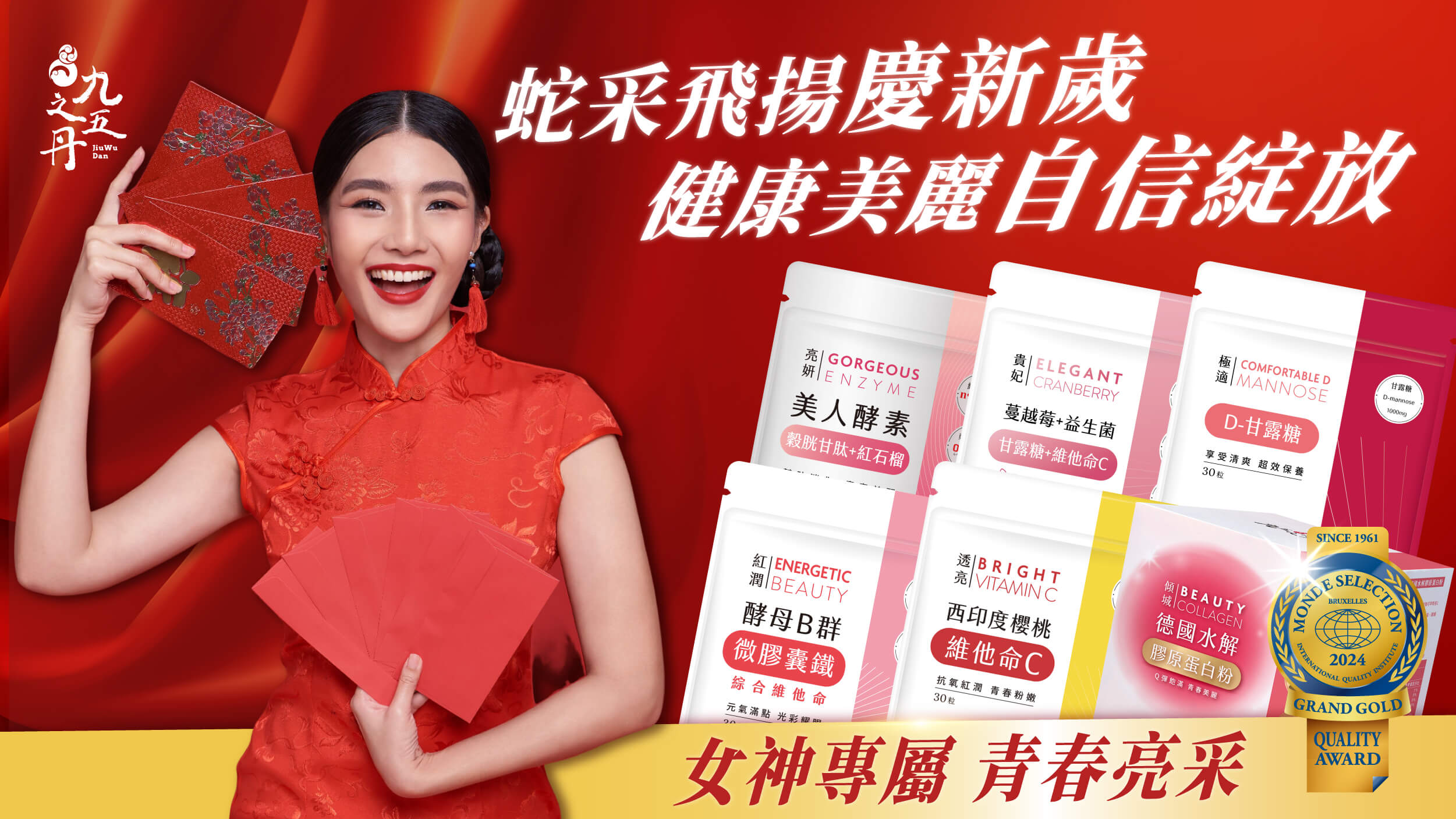 專為女性設計福袋組,嚴選六大女性保健(美人酵素、蔓越莓益生菌、甘露糖、B群鐵、維他命、膠原蛋白)隨機出貨,共有三種規格($1500、$3000和$5000)的福袋,絕對物超所值,即日起至2/15,限量共300份!從養顏美容、營養補給到私密調理,九五之丹將成為你的完美夥伴,在迎接蛇年的美好時刻,助你一整年青春美麗!