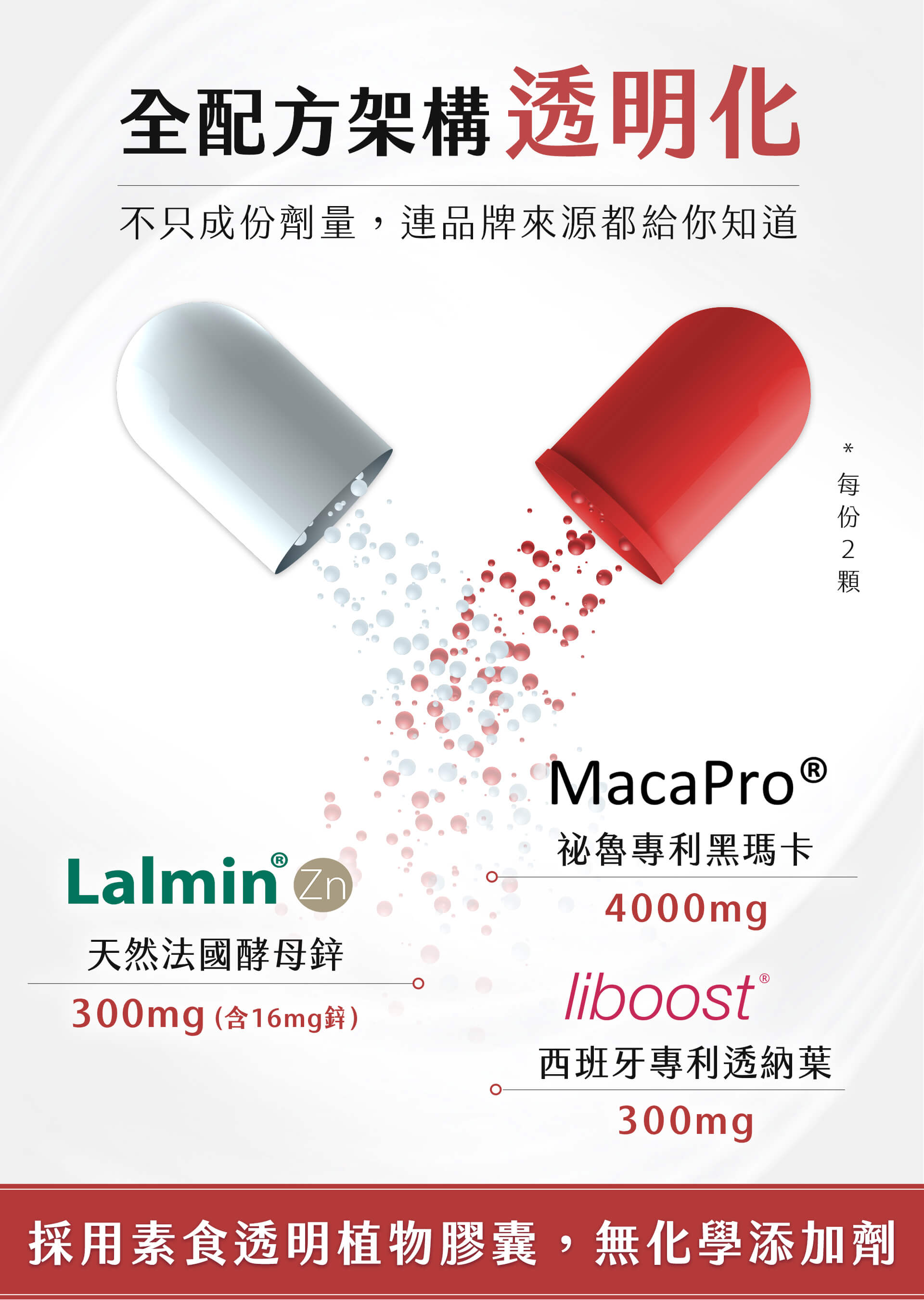 MacaPro®:黑瑪卡 Lalmin®:酵母鋅 Liboost®:透納葉