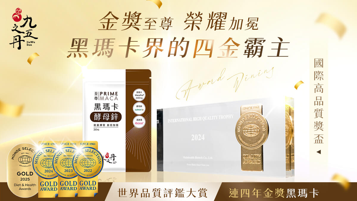 在世界品質評鑑大會上,除了每年針對優秀產品頒發特金獎、金獎、銀獎和銅獎外,對於連續四年獲得特金獎或金獎的優質產品,還會頒發更高等級的特殊獎盃-國際高品質獎盃,是該品項的最高榮譽象徵。「至尊.黑瑪卡+酵母鋅」在2024年奧地利維也納舉辦的世界品質評鑑中榮獲此殊榮,也使九五之丹成為台灣第一個在黑瑪卡品項上獲得此特殊獎盃的品牌。