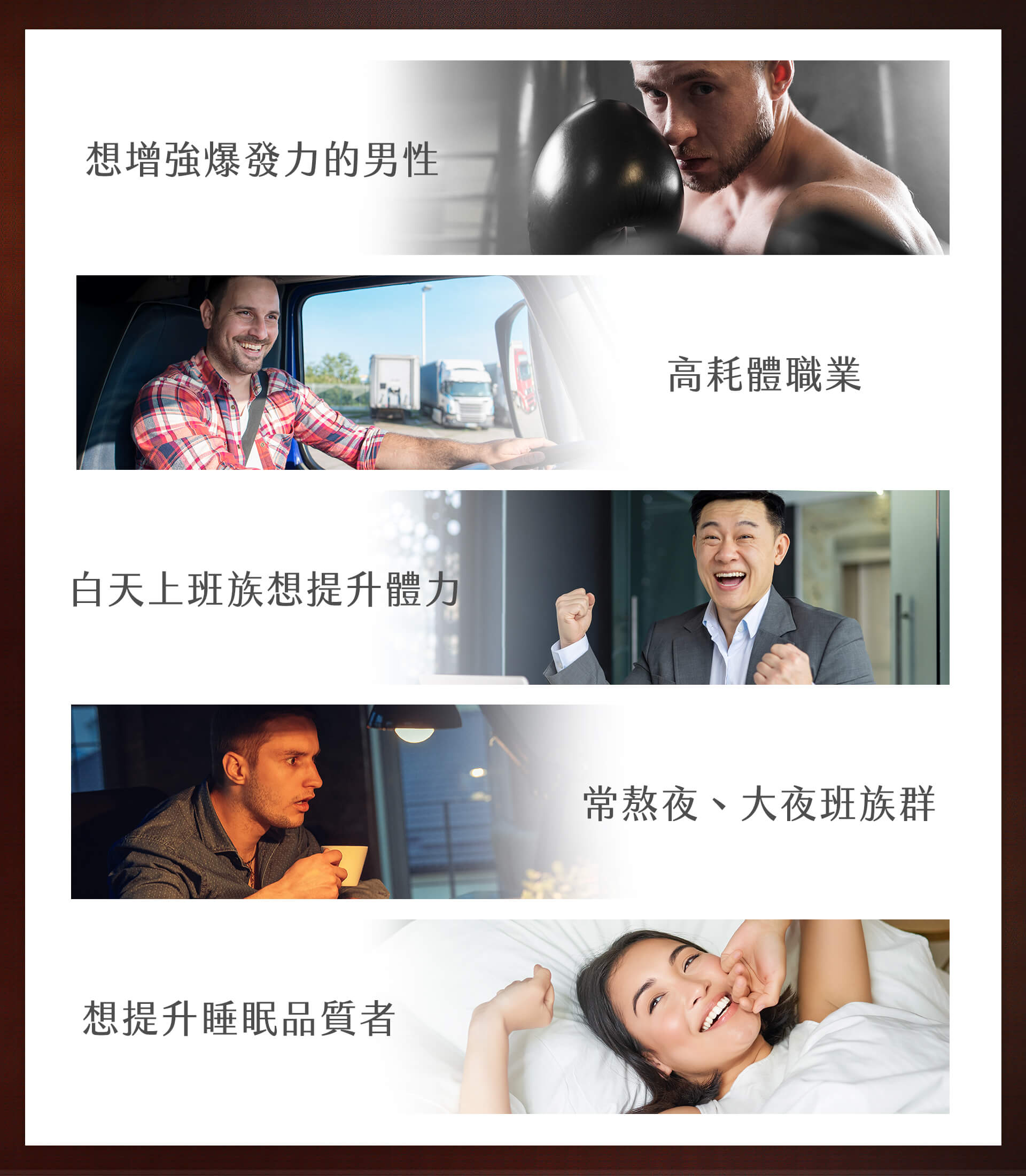 | 適用族群 | 上班族、體力勞動者、大夜班、想強化夜生活族群 |