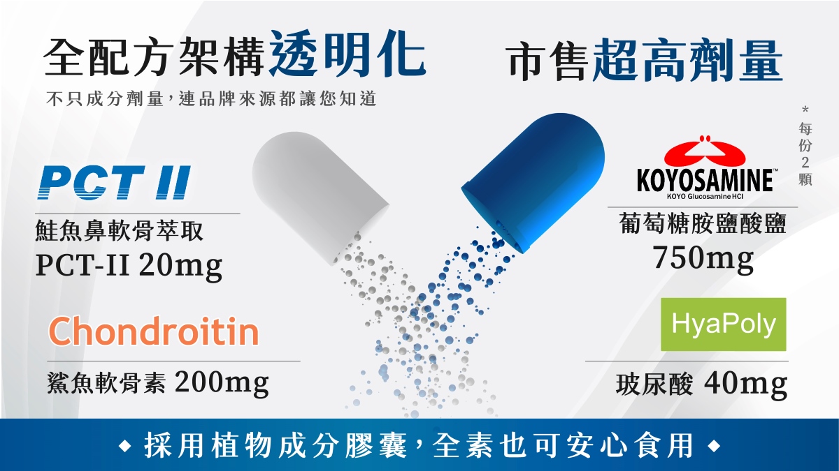 | 成份 | 每份2粒,含日本PCTII鮭魚鼻軟骨萃取20mg(40% UC2+40%蛋白聚醣)、日本Koyosamine®葡萄糖胺鹽酸鹽750mg、美國鯊魚軟骨素200mg、Haplex®玻尿酸40mg |